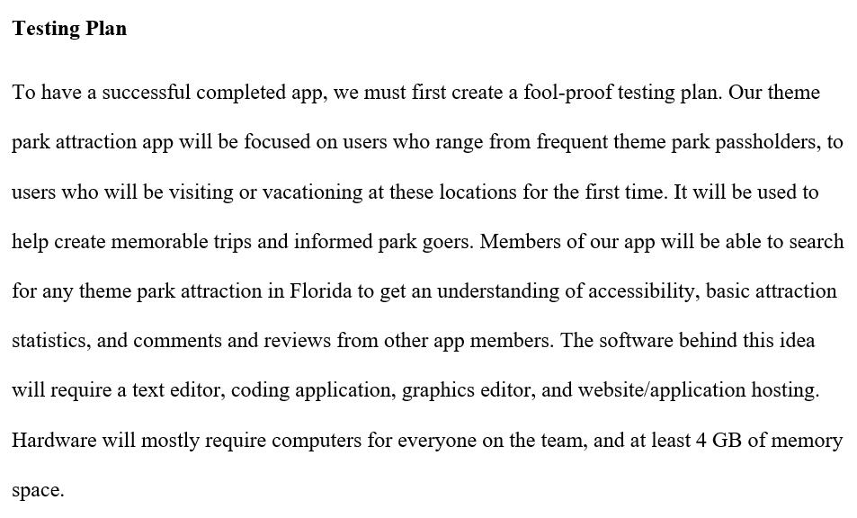 In order to ensure that a quality product is going to published to market, there needs to be a thorough testing plan. This document outlines the specific tests that will be performed on our application, ensuring that the final product is functioning properly and meets users needs. Following this testing plan will eliminate any bugs found in the testing process, understand what kinds of testing will be performed, make notes of issues encountered, and know when testing for the project is complete.