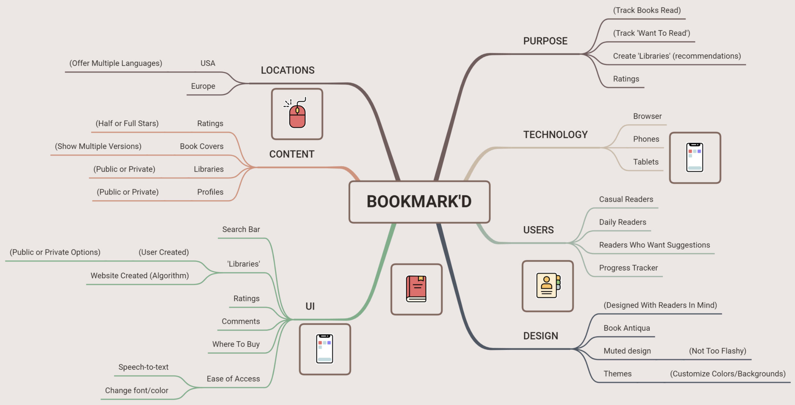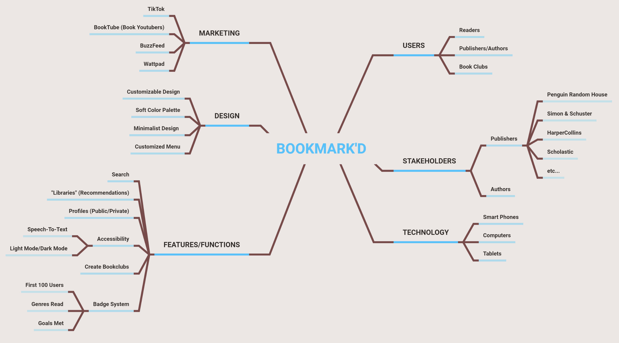 To ensure that our app meets our goals and user needs, we created a general Mind Map overview that outlines the app's features, user interface, and functionality. It serves as a visual representation of our app's architecture, allowing us to see how each component fits into the overall design. By mapping out the app's structure in advance, we can identify any potential roadblocks or design flaws and make changes accordingly.We also created a Mind Map that allowed us to discuss various methods of marketing the app, various features and functions the app can have, the types of users who would be in the market for Bookmark'd, different types of stakeholders who would be financially involved, and the technology that would be required to access our app.