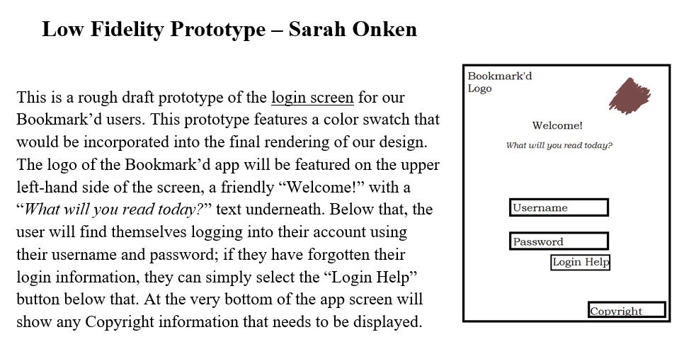 To ensure that our Bookmark'd app is user-friendly and intuitive, we created a low fidelity prototype that includes the most critical features and basic design elements. This helps to focus our efforts and does not unnecessarily waste significant time and resources. It also ensures that the final version of the app aligns with our overall goal of the product and meets the needs of our users. This prototype also allows everyone in the group to be on the same page with the design as we head towards the final design of the product.