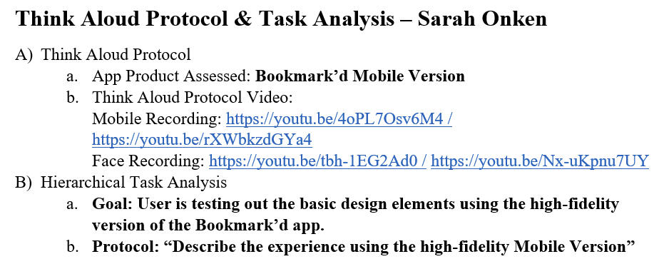 Using the comments from the previous think aloud protocol, we focused on our high-fidelity mobile version for the Bookmark'd app, ensuring that it was intuitive and user-friendly. Participants were asked to maneuver the app while verbalizing their thought processes. By incorporating user feedback into our app development process, we were able to improve the user experience while also meeting our goals and exceeding user expectations.
