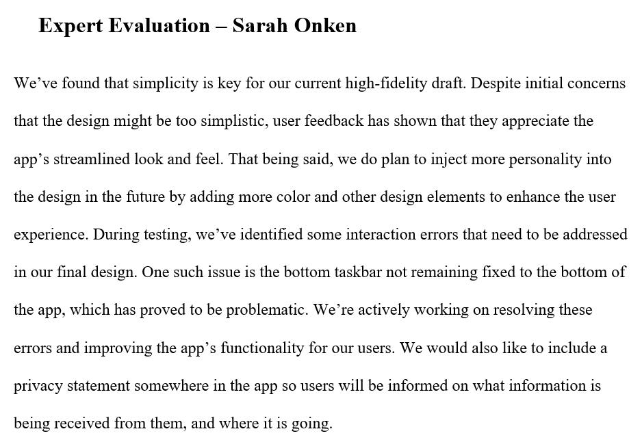 Looking back on the research and bug-testing conducted in the process of building Bookmark'd, we wrote a brief assessment of the design, usability, interface, and overall user experience. The expert evaluation uncovered several usability issues, such as unclear navigation, inconsistent design elements, and transparency of data storage. This reflection allowed us to refine the app's design and improve the overall user experience.