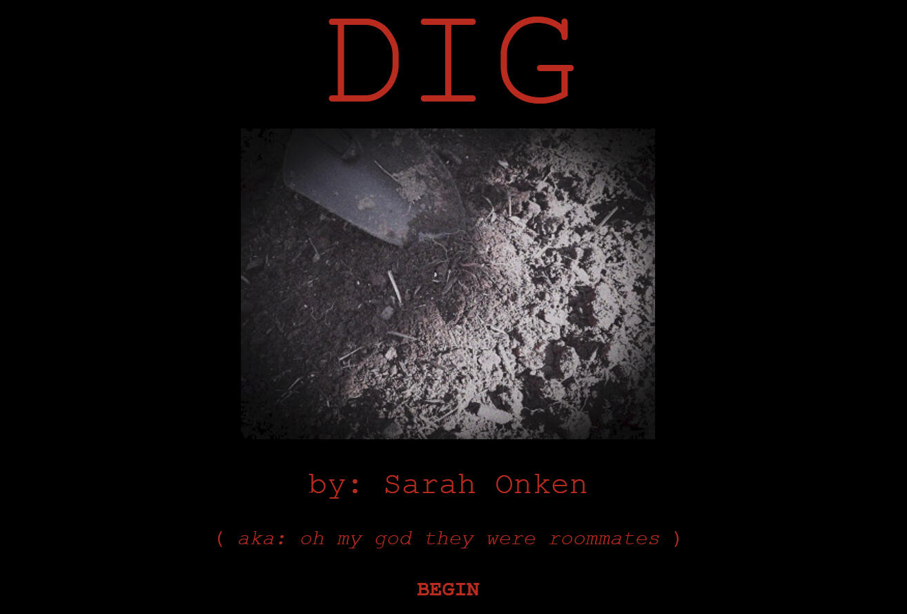 "DIG - Interactive Twine Short Story" was a project written during my Digital Culture and Narrative 2019 class at UCF. The idea behind the assignment was learning how to use Twine to create a compelling responsive interactive narrative using the program Twine. This was created using a mix of HTML, photo editing, and creative writing. "DIG" is a dark humor interactive piece about the murder of an annoying roommate, and attempting to get away with it.