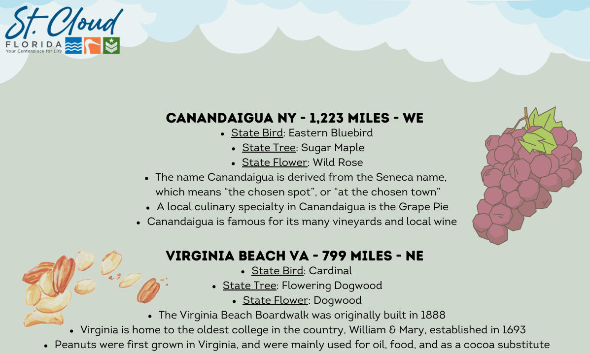 Scanning the QR code for the first sign will lead to a PDF file that I created and designed. Every location listed on the physical signs are each listed on here on their respective files. Each sign includes interesting facts about each location, as well as eye-catching visuals that correspond with them. This sign includes the locations of: Canandaigua NY, Virginia Beach VA, Sarasota FL, Universal Studios FL, Orlando FL, West Melbourne FL, Miami FL, and Lake Waccamaw NC.