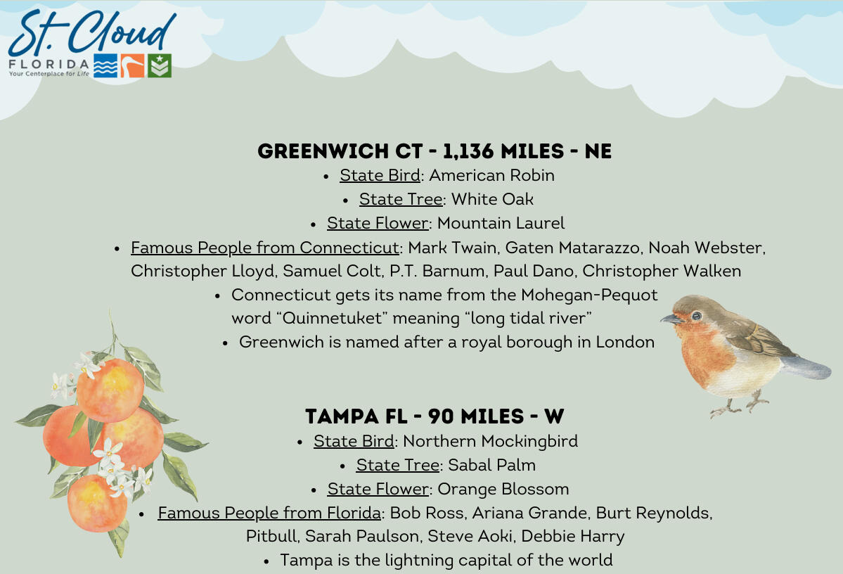 Scanning the QR code for the second sign will lead to the second PDF file that I created and designed. Every location listed on the physical signs are each listed on here on their respective files. Each sign includes interesting facts about each location, as well as eye-catching visuals that correspond with them. This sign includes the locations of: Greenwich CT, Tampa FL, Disney World FL, Cocoa FL, Bel Air MD, Bo. Campanillas PR, and Colonia NJ.